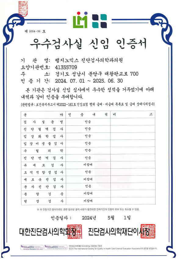 우수검사실 신임인증서
