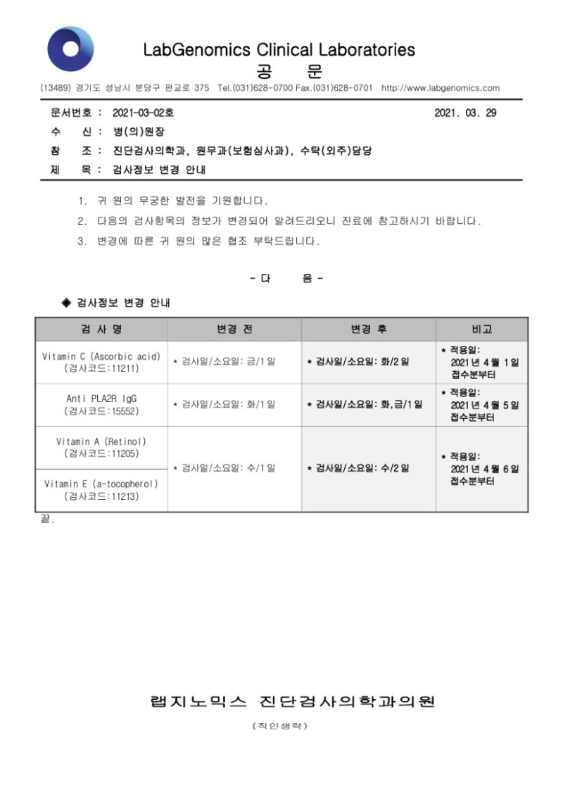 [공문] Vitamin C (Ascorbic acid) 외 3항목 검사정보변경안내