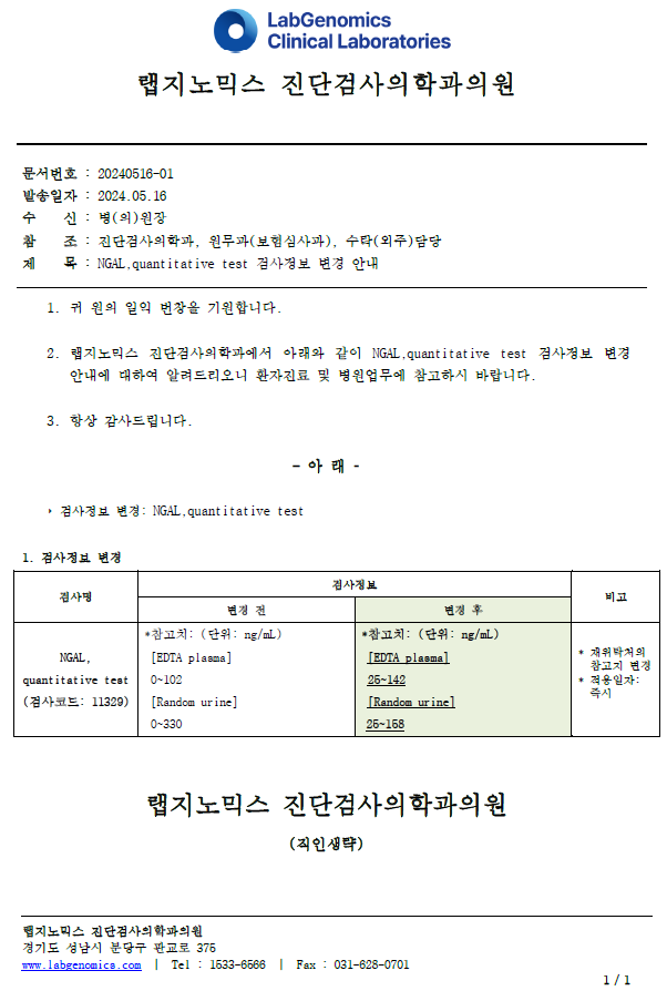 공문[20240516-01호] NGAL, quantitative test 검사정보 변경 안내 슈퍼관리자 2024-05-16 09:00:00 슈퍼관리자 0 568 2024.05.16 09:00 2025.03.21 15:42 공문[20240516-01호]NGAL.pdf (127.4K) NGAL, quantitative test 검사정보 변경에 대하여 다음과 같이 공유 드리오니, 확인 후 업무에 적용해 주시기 바랍니다. •주요내용 ‣ 검사정보 변경: NGAL,quantitative test