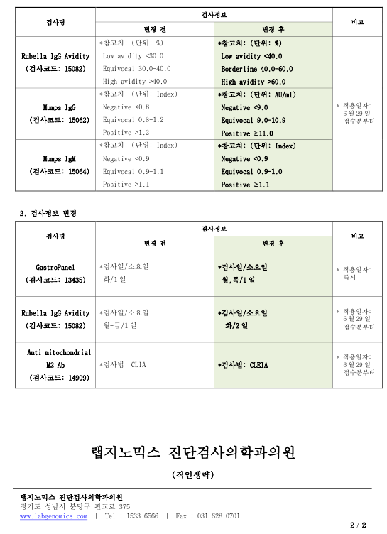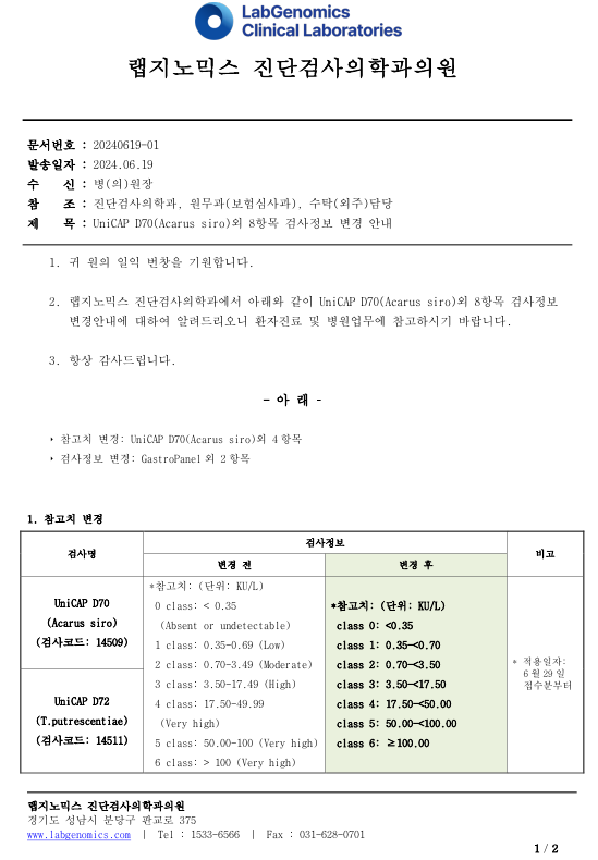 공문[20240619-01호] UniCAP D70(Acarus siro)외 8항목 검사정보 변경에 대하여 다음과 같이 공유 드리오니, 확인 후 업무에 적용해 주시기 바랍니다.