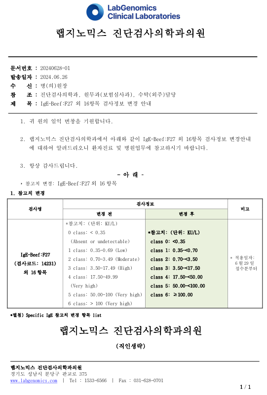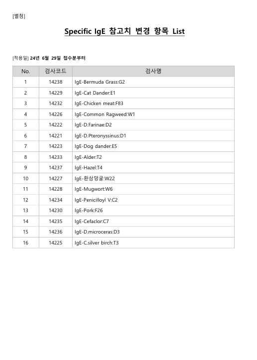공문[20240626-01호] IgE_Beef_F27외 16항목 검사정보 변경에 대하여 다음과 같이 공유 드리오니, 확인 후 업무에 적용해 주시기 바랍니다.