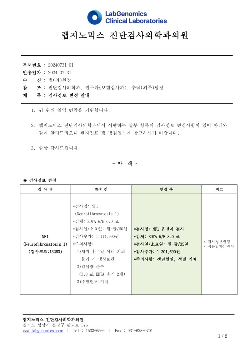 공문[20240731-01호] NF1(Neurofibromatosis 1)검사정보변경 안내 최고관리자 2024-10-11 14:15:40 최고관리자 0 482 2024.10.11 14:15 2024.10.11 14:15 공문[20240731-01호] NF1Neurofibromatosis 1검사정보변경 안내.pdf (149.8K) 공문[20240731-01호] NF1(Neurofibromatosis 1)외 1항목 검사정보변경에 대하여 다음과 같이 공유 드리오니, 확인 후 업무에 적용해 주시기 바랍니다.