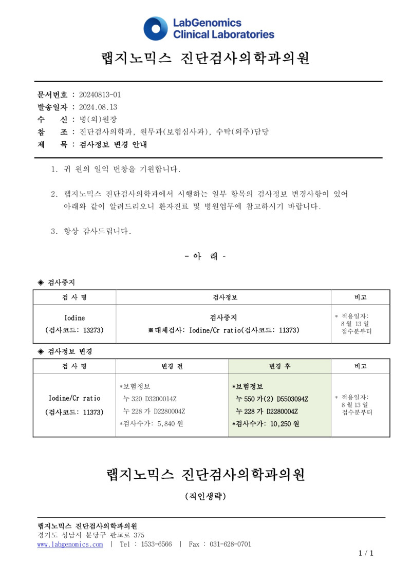 공문[20240813-01호]Iodine 검사정보변경 안내 최고관리자 2024-10-11 14:19:12 최고관리자 0 508 2024.10.11 14:19 2024.10.11 14:19 공문[20240813-01호]Iodine 검사정보변경 안내.pdf (129.0K) 공문[20240813-01호]Iodine 검사정보변경에 대하여 다음과 같이 공유 드리오니, 확인 후 업무에 적용해 주시기 바랍니다.