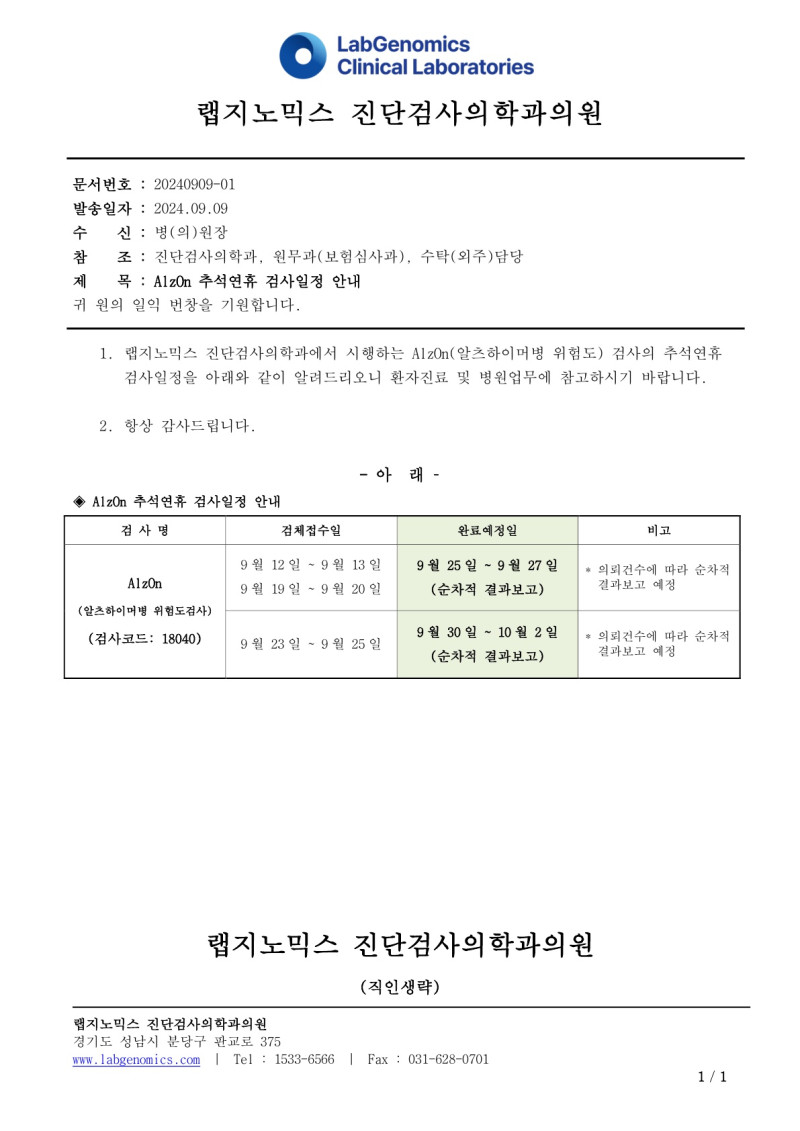 공문[20240909-01호]AlzOn 추석연휴일정안내 최고관리자 2024-10-11 14:36:15 최고관리자 0 567 2024.10.11 14:36 2024.10.11 14:36 공문[20240909-01호]AlzOn 추석연휴일정안내.pdf (124.8K) 공문[20240909-01호]AlzOn 추석연휴일정안내에 대하여 다음과 같이 공유 드리오니, 확인 후 업무에 적용해 주시기 바랍니다.