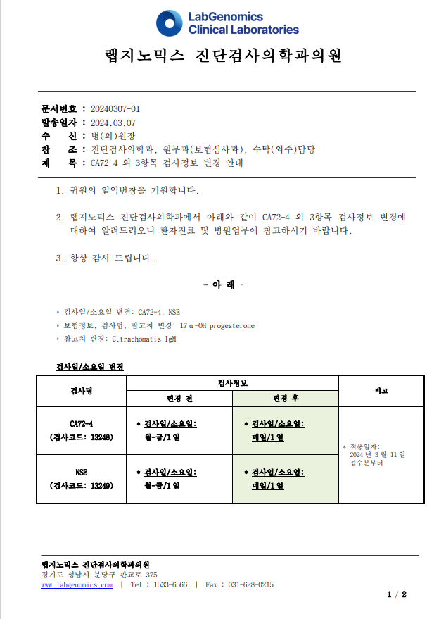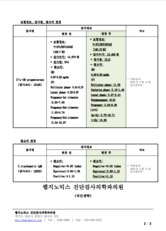 추가공문[20240307-01호] CA72-4 외 3항목 검사정보 변경 안내 슈퍼관리자 2024-03-07 09:00:00 슈퍼관리자 0 510 2024.03.07 09:00 2025.03.21 15:29 추가공문[20240307-01호] CA72-4 외 3항목 검사정보 변경 안내.pdf (137.8K) 3월 6일 게시한 공문[20240306-01호]에 추가사항이 발생하여 다음과 같이 공유 드리오니, 확인 후 업무에 적용해 주시기 바랍니다. ∘주요내용 ‣ 보험정보, 검사법, 참고치 변경: 17α-OH progesterone (추가내용) 17α-OH progesterone(검사코드: 13126) 참고치: "Postmenopause: <0.91"
