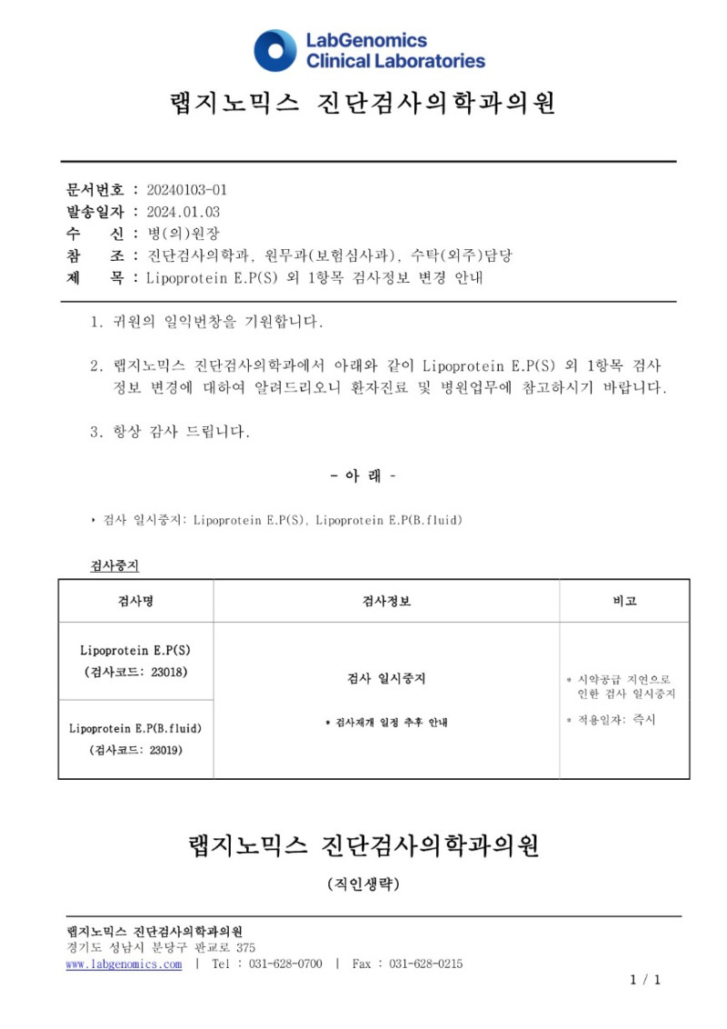 공문[20240103-01호] Lipoprotein E.P(S) 외 1항목 검사정보 변경 안내 슈퍼관리자 2024-01-04 09:00:00 슈퍼관리자 0 617 2024.01.04 09:00 2025.03.21 15:18 공문[20240103-01호] Lipoprotein E.PS 외 1항목 검사정보 변경 안내.pdf (114.8K) Lipoprotein E.P(S) 외 1항목 검사정보 변경에 대하여 다음과 같이 공유 드리오니, 확인 후 업무에 적용해 주시기 바랍니다. ∘주요내용 ‣ 검사중지: Lipoprotein E.P(S), Lipoprotein E.P(B.fluid)