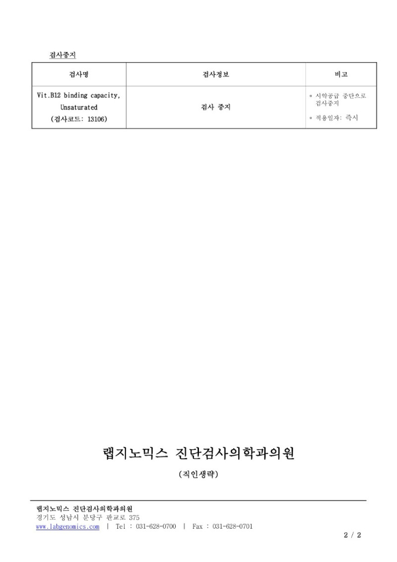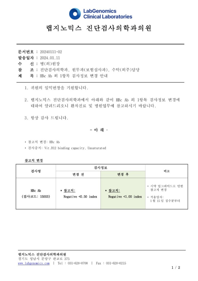 공문[20240111-02호] Hbc Ab 외 1항목 검사정보 변경 안내 슈퍼관리자 2024-01-11 09:00:01 슈퍼관리자 0 547 2024.01.11 09:00 Hbc Ab 외 1항목 검사정보 변경에 대하여 다음과 같이 공유 드리오니, 확인 후 업무에 적용해 주시기 바랍니다. ∘주요내용 ‣ 참고치 변경: HBc Ab ‣ 검사중지: Vit.B12 binding capacity, Unsaturated