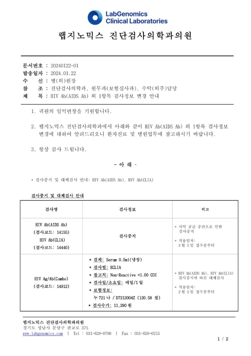 공문[20240122-01호] HIV Ab(AIDS Ab) 외 1항목 검사정보 변경 안내 슈퍼관리자 2024-01-23 09:00:00 슈퍼관리자 0 527 2024.01.23 09:00 2025.03.21 15:23 공문[20240122-01호] HIV AbAIDS Ab 외 1항목 검사정보 변경 안내.pdf (129.5K) HIV Ab(AIDS Ab) 외 1항목 검사정보 변경에 대하여 다음과 같이 공유 드리오니, 확인 후 업무에 적용해 주시기 바랍니다. ∘주요내용 ‣ 검사중지 및 대체검사 안내: HIV Ab(AIDS Ab), HIV Ab(CLIA)