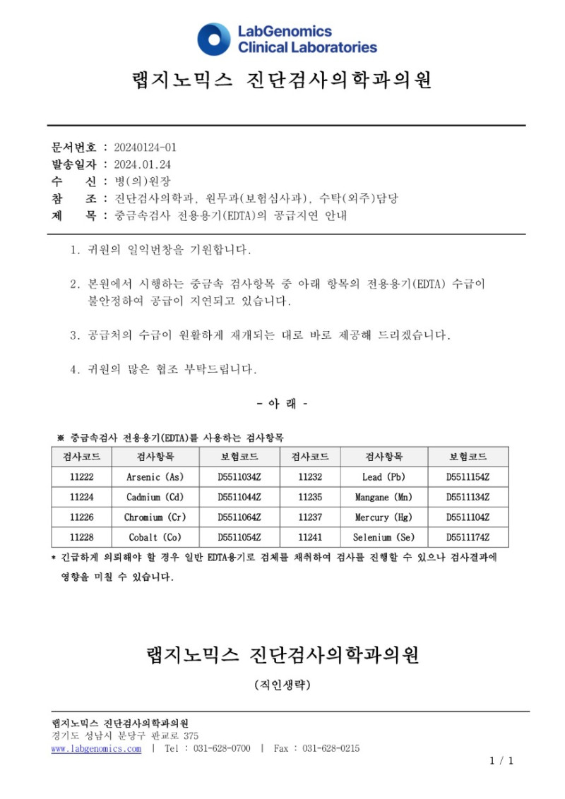 공문[20240124-01호] 중금속검사 전용용기(EDTA)의 공급지연 안내 슈퍼관리자 2024-01-25 09:00:00 슈퍼관리자 0 547 2024.01.25 09:00 2025.03.21 15:24 공문[20240124-01호] 중금속검사 전용용기EDTA의 공급지연 안내.pdf (118.5K) 중금속검사 전용용기(EDTA)의 공급지연에 대하여 다음과 같이 공유 드리오니, 확인 후 업무에 적용해 주시기 바랍니다. ∘주요내용 ‣ 중금속검사 전용용기(EDTA)의 공급지연