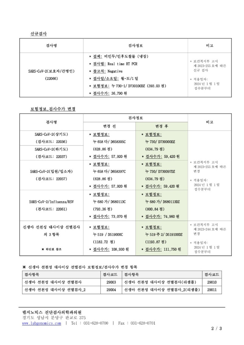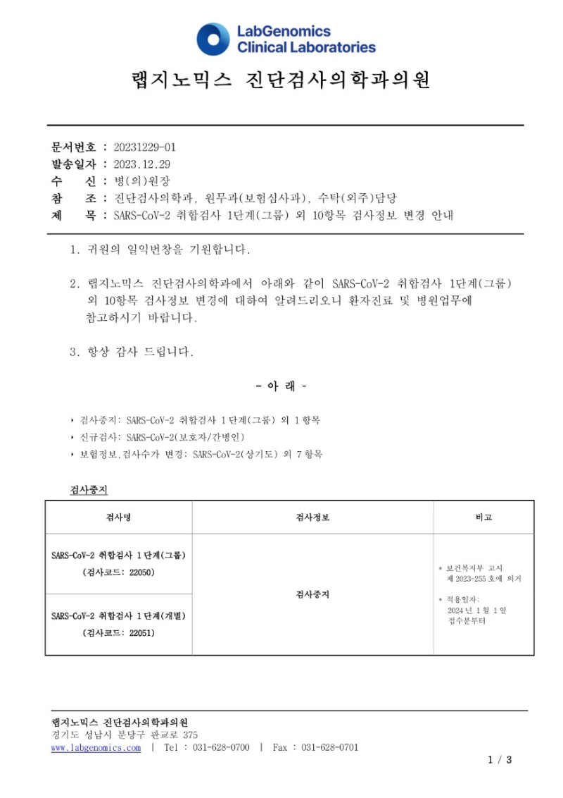 공문[20231229-01호] SARS-CoV-2 취합검사 1단계(그룹) 외 10 항목 검사정보 변경 안내 슈퍼관리자 2023-12-29 09:00:01 슈퍼관리자 0 609 2023.12.29 09:00 2025.03.21 15:16 공문[20231229-01호] SARS-CoV-2 취합검사 1단계그룹 외 10항목 검사정보 변경 안내.zip (892.7K) SARS-CoV-2 취합검사 1단계(그룹) 외 10항목 검사정보 변경에 대하여 다음과 같이 공유 드리오니, 확인 후 업무에 적용해 주시기 바랍니다. ∘주요내용 ‣ 검사중지: SARS-CoV-2 취합검사 1단계(그룹) 외 1항목 ‣ 신규검사: SARS-CoV-2(보호자/간병인) ‣ 보험정보,검사수가 변경: SARS-CoV-2(상기도) 외 7항목