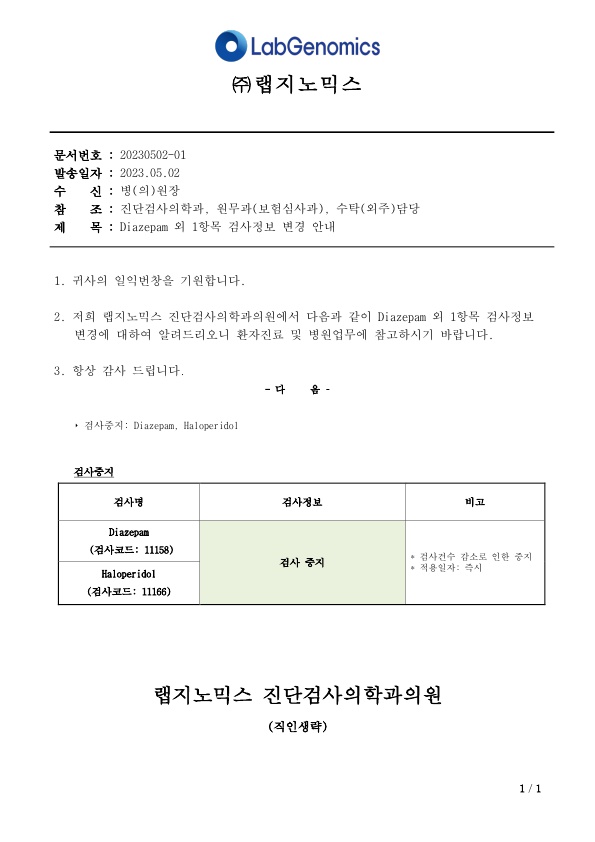 Diazepam 외 1항목 검사정보 변경에 대하여 다음과 같이 공유 드리오니, 확인 후 업무에 적용해 주시기 바랍니다.