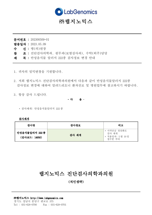 공문[20230509-01호] 만성음식물알러지 222종 검사정보 변경 슈퍼관리자 2023-05-09 09:00:00 슈퍼관리자 0 623 2023.05.09 09:00 2025.03.21 14:51 공문[20230509-01호] 만성음식물알러지 222종 검사정보 변경.pdf (107.8K) 만성음식물알러지 222종 검사정보 변경에 대하여 다음과 같이 공유 드리오니, 확인 후 업무에 적용해 주시기 바랍니다. ∘주요내용 ‣검사재개: 만성음식물알러지 222종