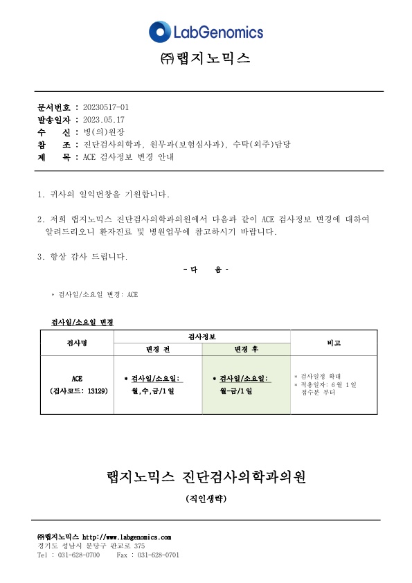 공문[20230517-01호] ACE 검사정보 변경 안내 슈퍼관리자 2023-05-17 09:00:00 슈퍼관리자 0 556 2023.05.17 09:00 2025.03.21 14:52 공문[20230517-01호] ACE 검사정보 변경 안내.pdf (106.7K) ACE 검사정보 변경에 대하여 다음과 같이 공유 드리오니, 확인 후 업무에 적용해 주시기 바랍니다. ∘주요내용 ‣검사일/소요일 변경: ACE