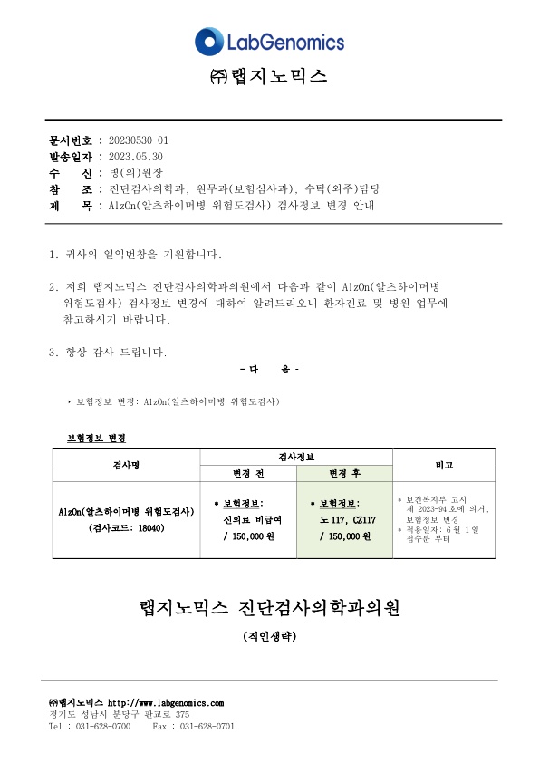 공문[20230530-01호] AlzOn(알츠하이머병 위험도검사) 검사정보 변경 안내