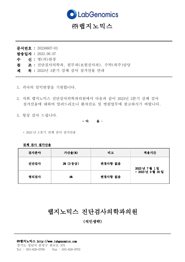 공문[20230607-01호] 2023년 3분기 검체 검사 질가산율 안내 슈퍼관리자 2023-06-07 09:00:00 슈퍼관리자 0 655 2023.06.07 09:00 2025.03.21 14:54 공문[20230607-01호] 2023년 3분기 검체 검사 질가산율 안내.pdf (106.5K) 2023년 3분기 검체 검사 질가산율에 대하여 다음과 같이 공유 드리오니, 확인 후 업무에 적용해 주시기 바랍니다. ∘주요내용 ‣ 2023년 3분기 검체 검사 질가산율