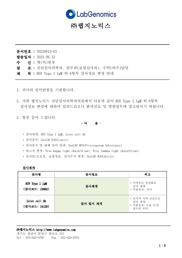 공문[20230612-01호] HSV Type 1 IgM 외 6항목 검사정보 변경 안내