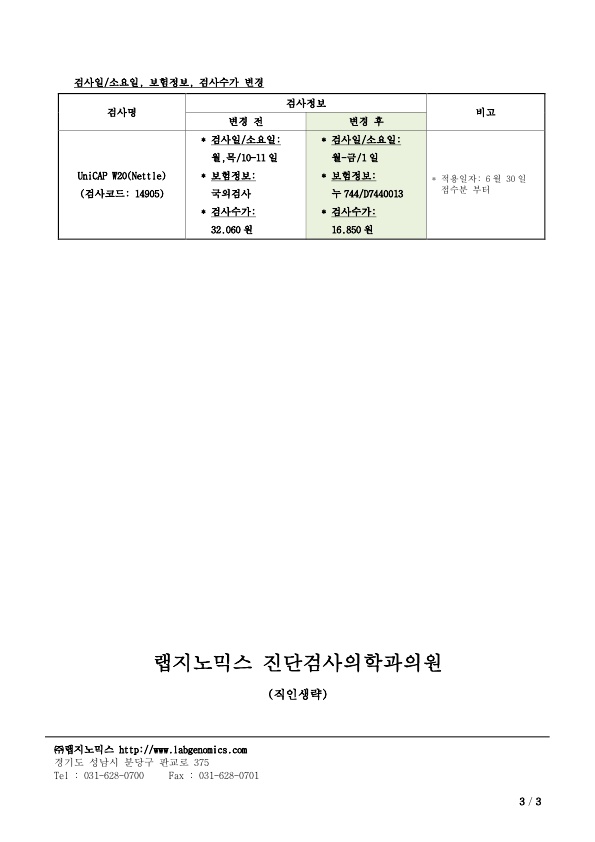 ‣ 검사일/소요일, 보험정보, 검사수가 변경: UniCAP W20(Nettle)