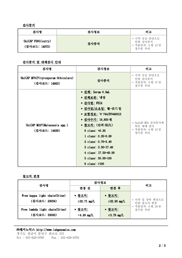 ‣ 검사중지 및 대체 검사 안내: UniCAP M70(Pityrosporum Orbiculare)