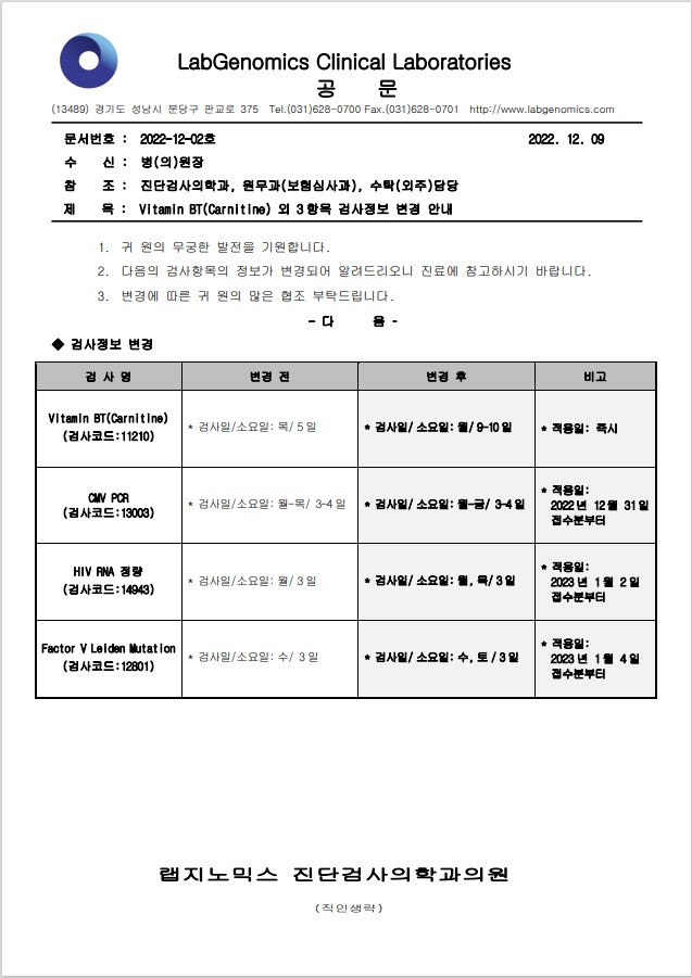 [공문] Vitamin BT(Carnitine) 외 3항목 검사정보 변경 안내