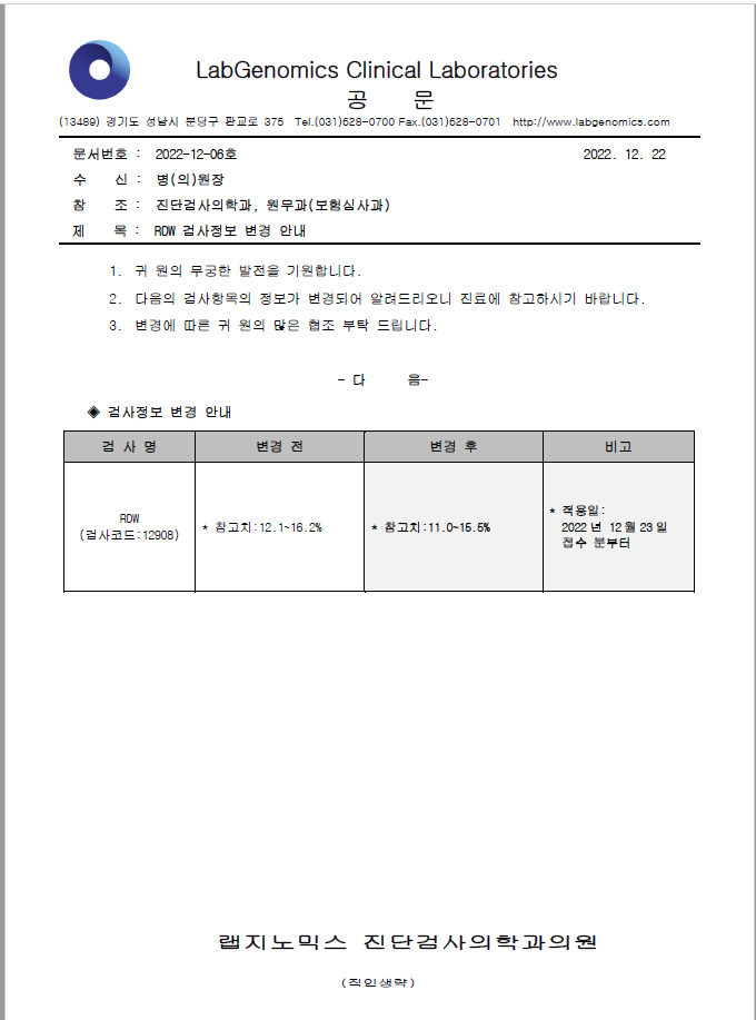 [공문] RDW 검사정보 변경 안내 슈퍼관리자 2022-12-22 09:00:00 슈퍼관리자 0 611 2022.12.22 09:00 2025.03.21 14:16 공문2022-12-06호 RDW 검사정보변경안내.pdf (86.4K) 1. 귀 원의 무궁한 발전을 기원합니다. 검사정보 변경이 있어 다음과 같이 알려드리오니 업무에 참고하시기 바랍니다. 2. 주요내용: - RDW (검사코드:12908) : 참고치 변경안내 * 적용일시: 2022년 12월23일 접수 분부터