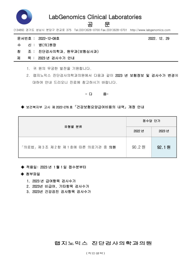 보건 복지부 고시 제2022-276호 건강보험요양급여비용 개정에 따른 "2023년 검사수가"를 다음과 같이 공지 하오니 확인 후 업무에  적용 바랍니다.