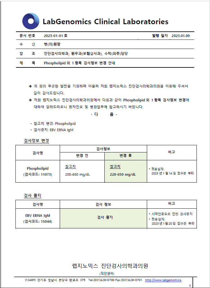 공문 [2023-01-01호] Phospholipid외 1항목 검사정보 변경 안내 슈퍼관리자 2023-01-09 09:00:00 슈퍼관리자 0 570 2023.01.09 09:00 2025.03.21 18:05 공문 [2023-01-01호] Phospholipid외 항목 검사정보 변경 안내.pdf (178.2K) Phospholipid외 1항목 검사정보 변경에 대하여 다음과 같이 공유 드리오니, 확인 후 업무에 적용해 주시기 바랍니다. ○ 주요내용 ▶ 참고치 변경: Phospholipid ▶ 검사중지: EBV EBNA IgM