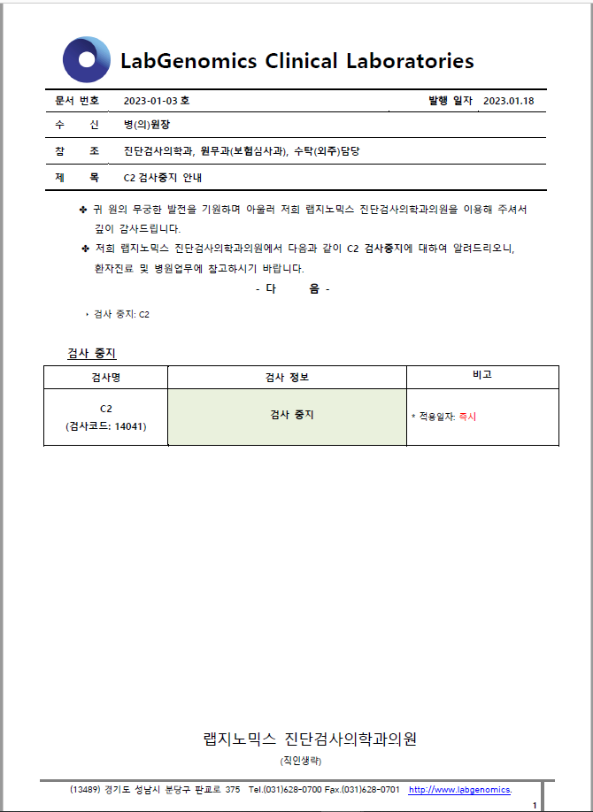 공문 [2023-01-02호] C2 검사중지 안내 슈퍼관리자 2023-01-18 09:00:00 슈퍼관리자 0 565 2023.01.18 09:00 2025.03.21 14:20 공문 [2023-01-03ȣ] C2 검사중지안내.pdf (166.3K) C2 검사중지에 대하여 다음과 같이 공유 드리오니, 확인 후 업무에 적용해 주시기 바랍니다. ∘주요내용 ‣ 검사중지: C2