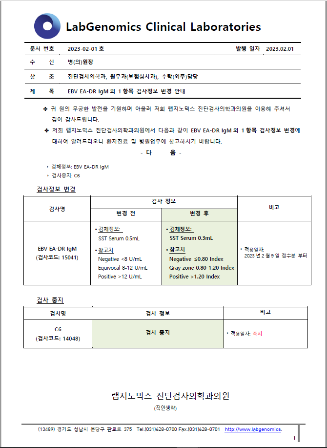 공문 [2023-02-01호] EBV EA DR IgM 외 1 항목 검사정보 변경 안내 슈퍼관리자 2023-02-01 09:00:00 슈퍼관리자 0 605 2023.02.01 09:00 2025.03.21 14:20 공문 [2023-02-01ȣ] EBV EA-DR IgM외 1항목 검사정보 변경 안내.pdf (183.7K) EBV EA-DR IgM 외 1항목 검사정보 변경에 대하여 다음과 같이 공유 드리오니, 확인 후 업무에 적용해 주시기 바랍니다. ∘주요내용 ‣ 검체정보: EBV EA-DR IgM ‣ 검사중지: C6