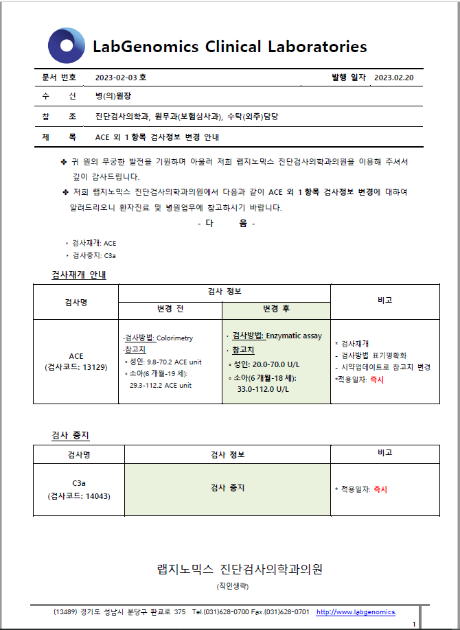 공문 [2023-02-03호] ACE 외 1 항목 검사정보 변경 안내 슈퍼관리자 2023-02-20 09:00:00 슈퍼관리자 0 562 2023.02.20 09:00 2025.03.21 14:22 공문 [2023-02-03ȣ] ACE 외 1항목 검사정보 변경 안내.pdf (224.8K) ACE 외 1항목 검사정보 변경에 대하여 다음과 같이 공유 드리오니, 확인 후 업무에 적용해 주시기 바랍니다. ∘주요내용 ‣ 검사재개: ACE ‣ 검사중지: C3a