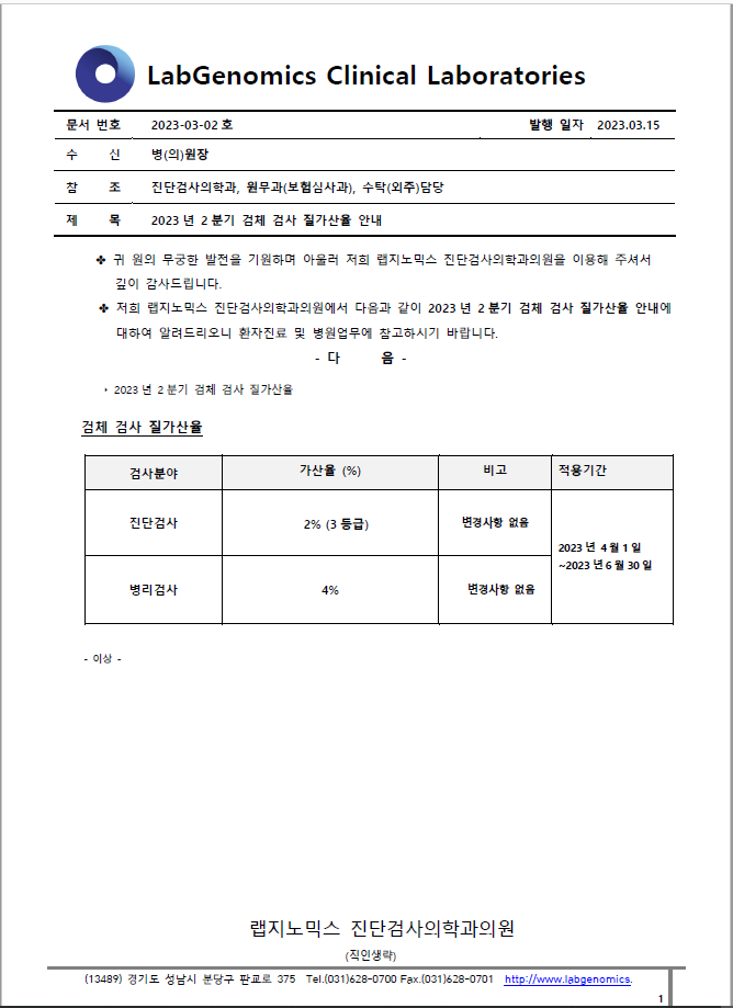 공문 [2023-03-02호] 2023년 2분기 검체 검사 질가산율 안내 슈퍼관리자 2023-03-15 09:00:00 슈퍼관리자 0 559 2023.03.15 09:00 2025.03.21 14:44 공문 [2023-03-02ȣ] 2023년 2분기 검체 검사 질가산율 안내.pdf (176.5K) "2023년 2분기 검체 검사 질가산율" 에 대하여 다음과 같이 공유 드리오니, 확인 후 업무에 적용해 주시기 바랍니다. ∘주요내용 ‣ 2023년 2분기 검체 검사 질가산율