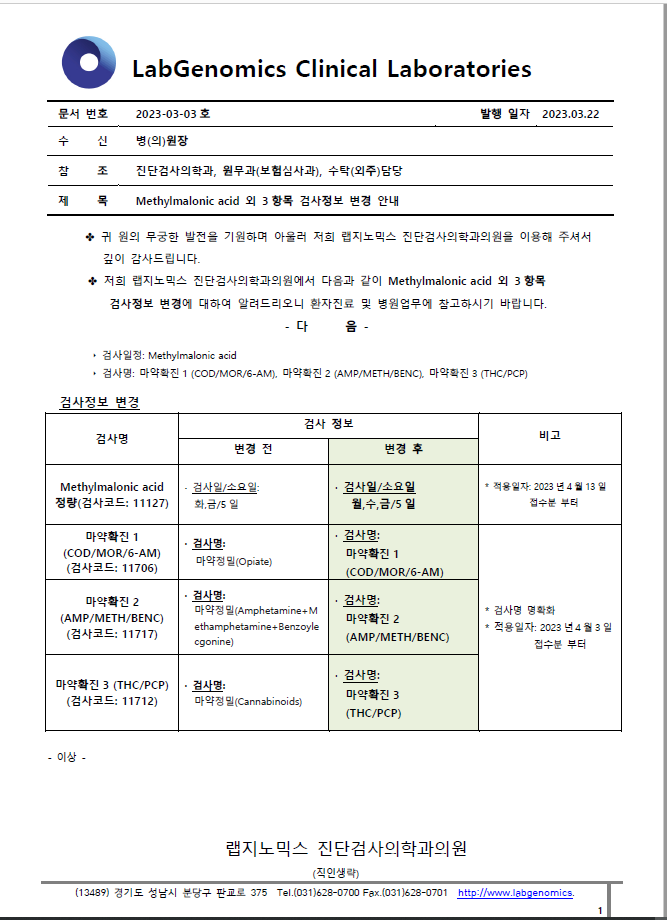 공문 [2023-03-03호] Methylmalonic acid 외 3항목 검사정보 변경 안내 슈퍼관리자 2023-03-22 09:00:00 슈퍼관리자 0 567 2023.03.22 09:00 2025.03.21 14:45 공문 [2023-03-03ȣ] Methylmalonic acid 외3항목 검사정보 변경 안내.pdf (231.2K) Methylmalonic acid 외 3항목 검사정보 변경에 대하여 다음과 같이 공유 드리오니, 확인 후 업무에 적용해 주시기 바랍니다. ∘주요내용 ‣ 검사일정: Methylmalonic acid ‣ 검사명: 마약확진1 (COD/MOR/6-AM), 마약확진2 (AMP/METH/BENC), 마약확진3 (THC/PCP)