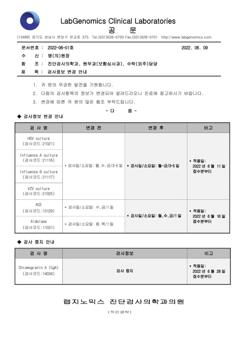 [공문] HSV culture 외 6항목 검사정보변경안내