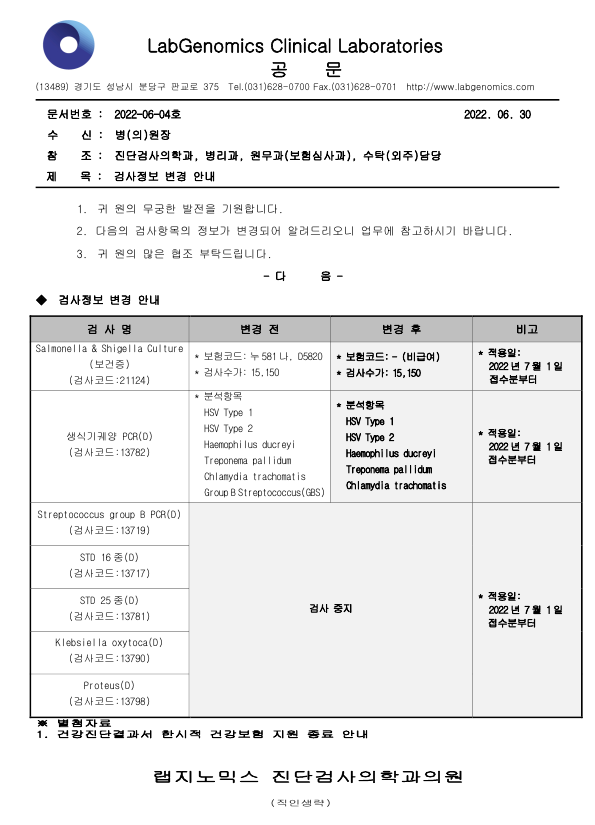 [공문] Salmonella & Shigella culture(보건증) 외 6항목 검사정보변경안내