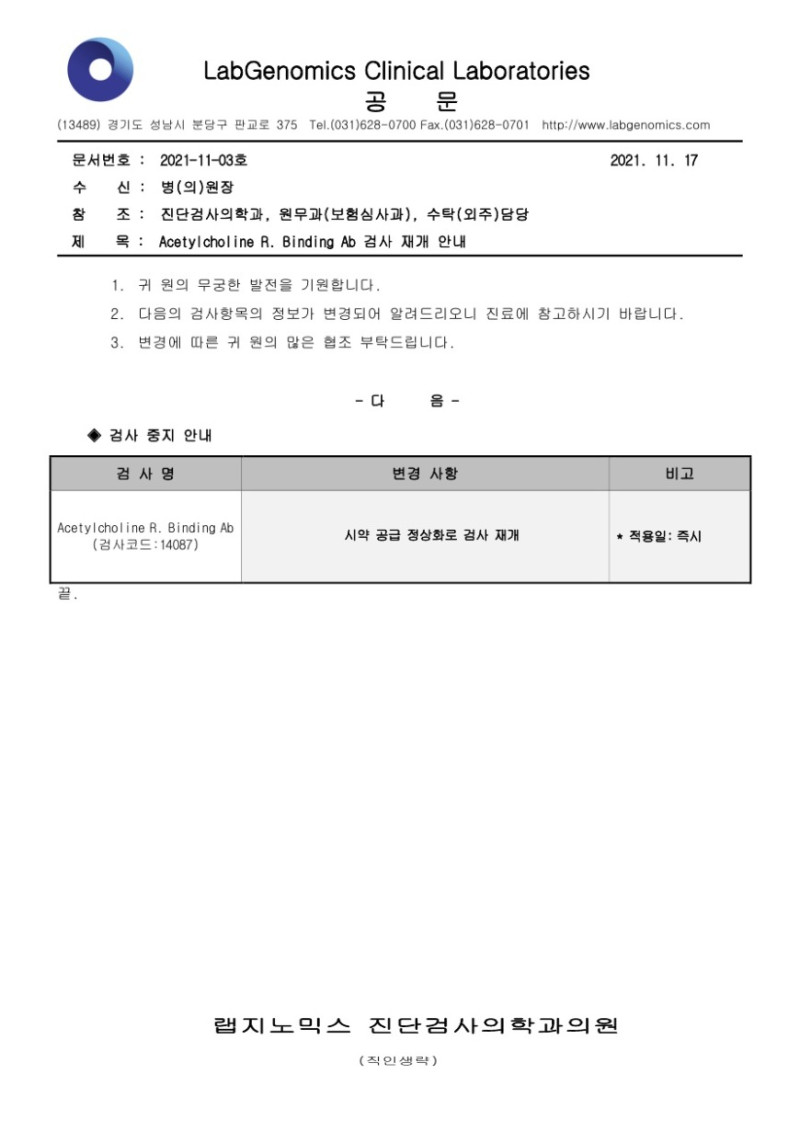 [공문] Acetylcholine R. Binding Ab 검사 재개 안내 슈퍼관리자 2021-11-17 09:00:00 슈퍼관리자 0 591 2021.11.17 09:00 2025.03.21 13:37 공문2021-11-03호 Acetylcholine R. Binding Ab 검사 재개 안내.pdf (88.3K) 1. 귀 원의 무궁한 발전을 기원합니다. 검사정보 변경이 있어 다음과 같이 알려드리오니 업무에 참고하시기 바랍니다 2. 주요내용: - Acetylcholine R. Binding Ab (검사코드:14087) : 검사 재개 안내 * 적용일시: 즉시 자세한 내용은 첨부파일을 참고하시기 바랍니다.