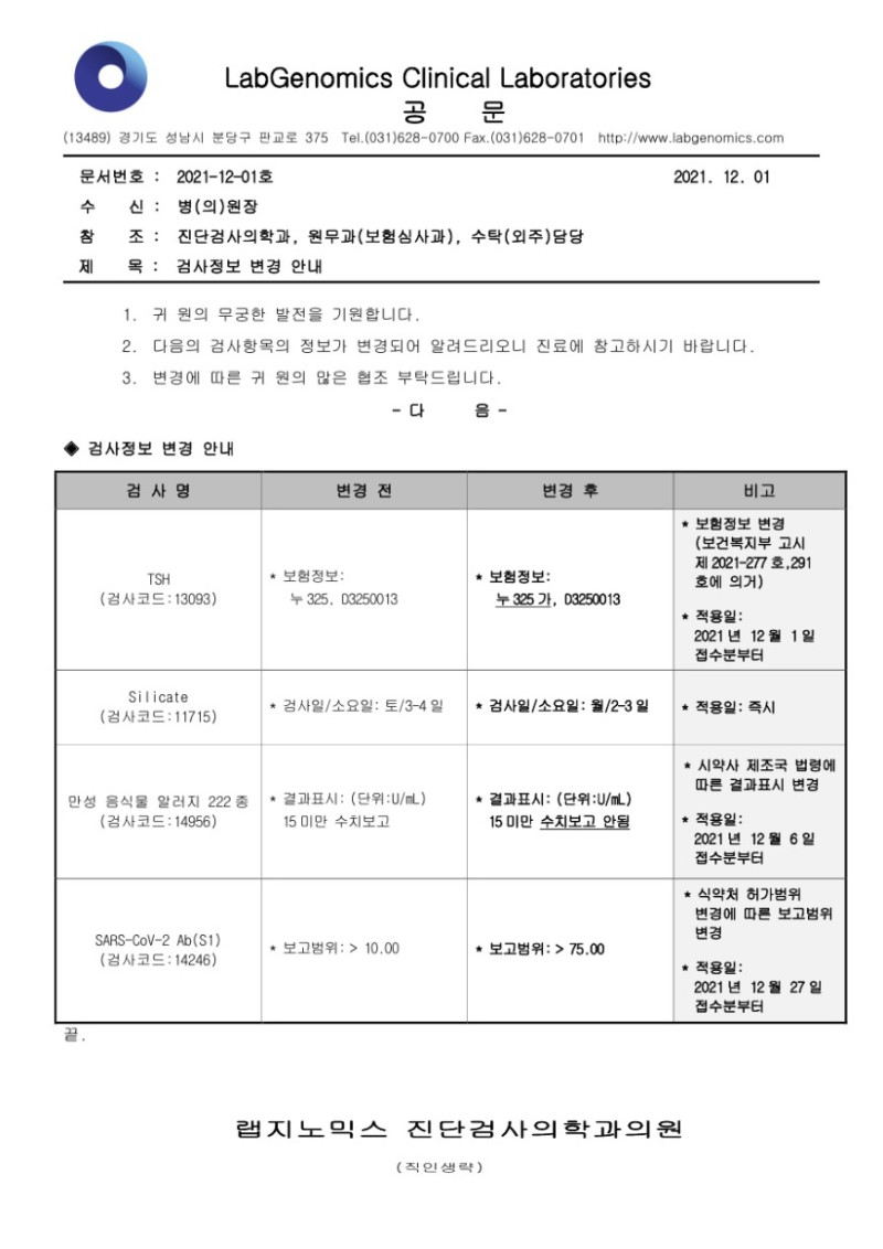 검사정보 변경이 있어 다음과 같이 알려드리오니 업무에 참고하시기 바랍니다.