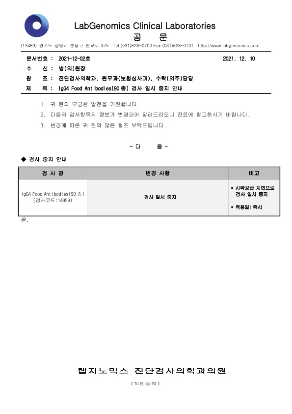 [공문] IgG4 Food Antibodies(90종) 검사 일시 중지 안내