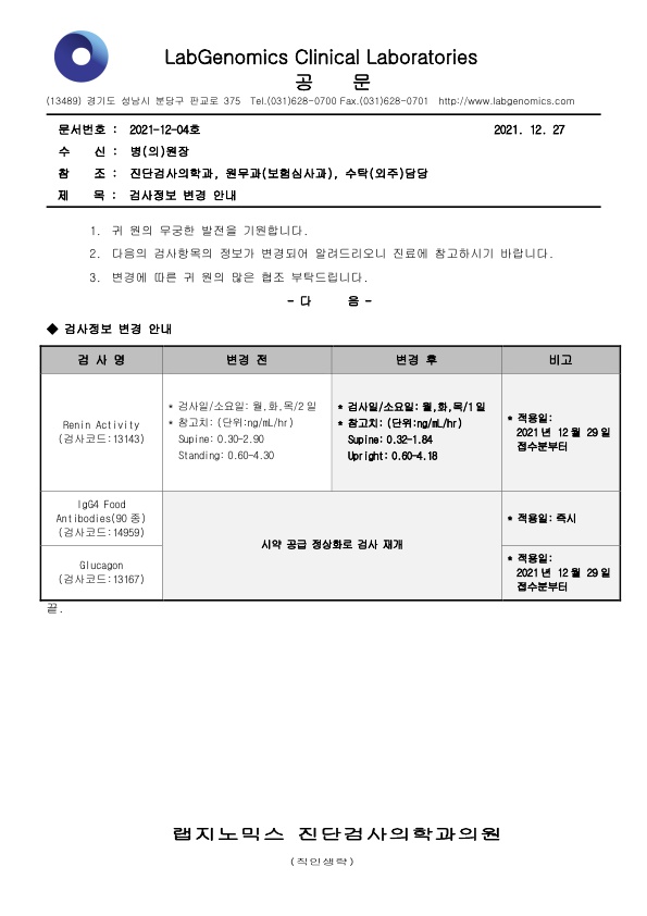 - Glucagon (검사코드:13167) : 시약 공급 정상화로 검사 재개안내