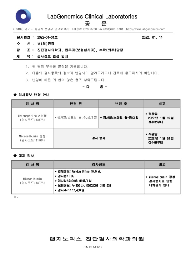 [공문] Metanephrine 2분획 외 1항목 검사정보변경안내