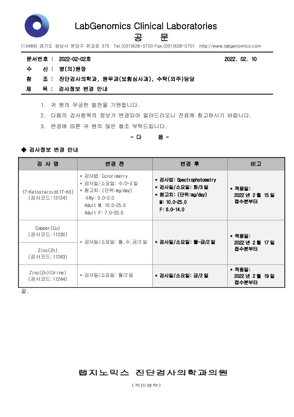 [공문] 17-Ketosteroid 외 3항목 검사정보변경안내
