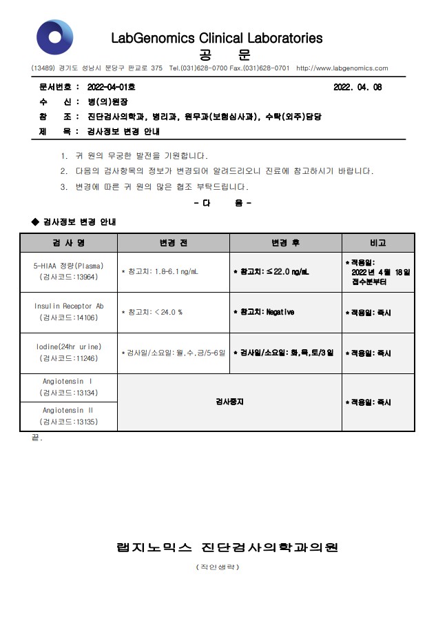 [공문] 5-HIAA정량(Plasma)외 4항목 검사정보변경안내