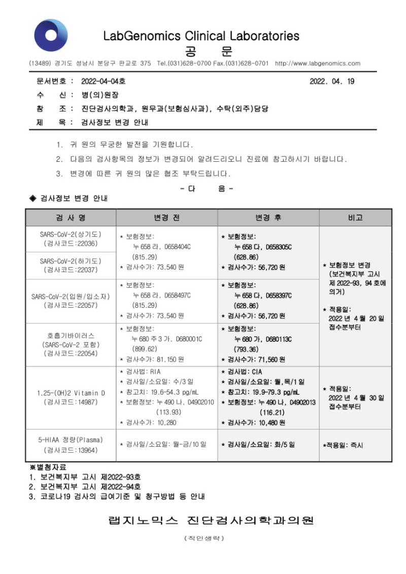 - SARS-CoV-2(하기도)(검사코드:22037) : 보험정보/검사수가 변경안내