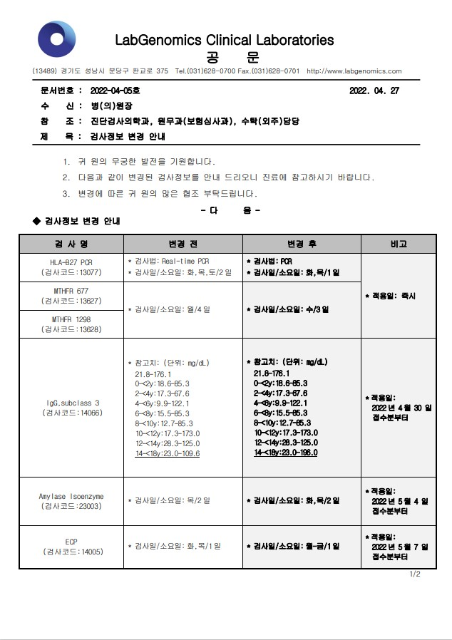 [공문] HLA-B27 PCR 외 11항목 검사정보변경안내