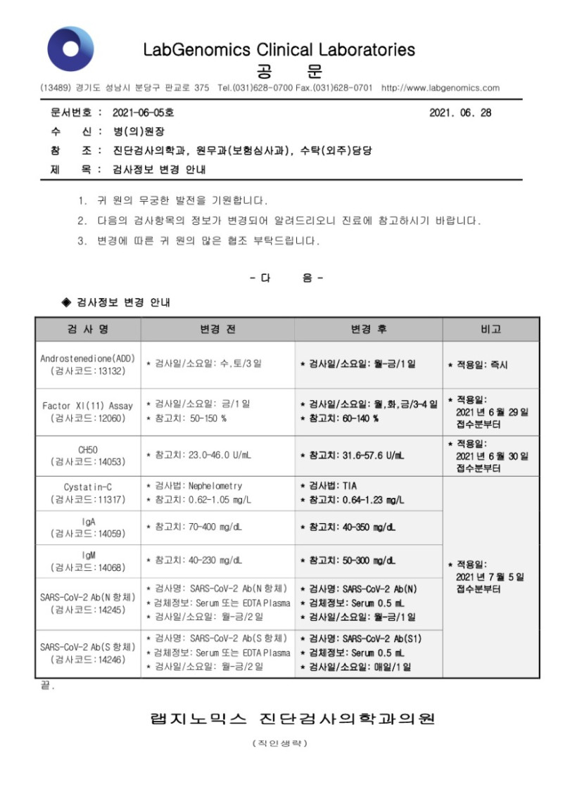 [공문] Androstenedione(ADD) 외 7항목 검사정보변경안내