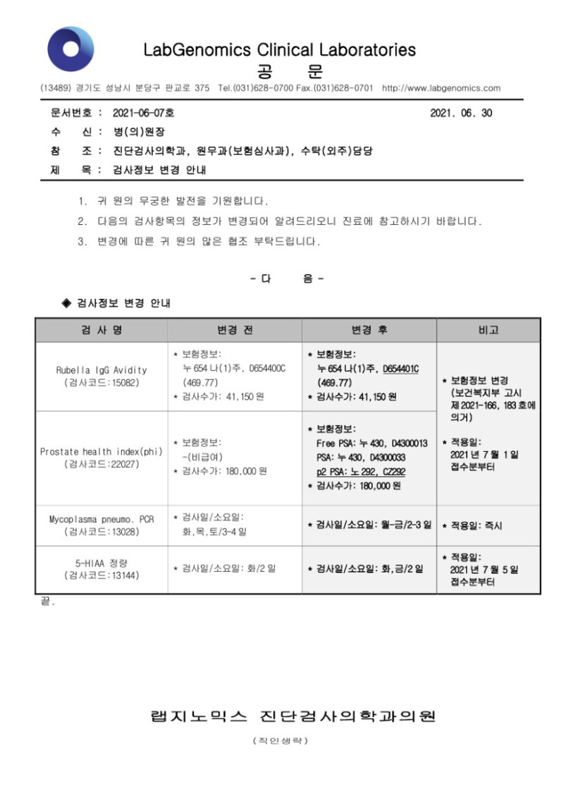 - Prostate health index(phi) (검사코드:22027) : 보험정보/검사수가 변경안내