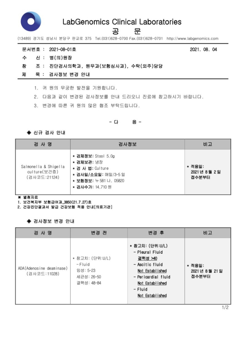 [공문] Salmonella & Shigella culture 외 2항목 검사정보변경안내