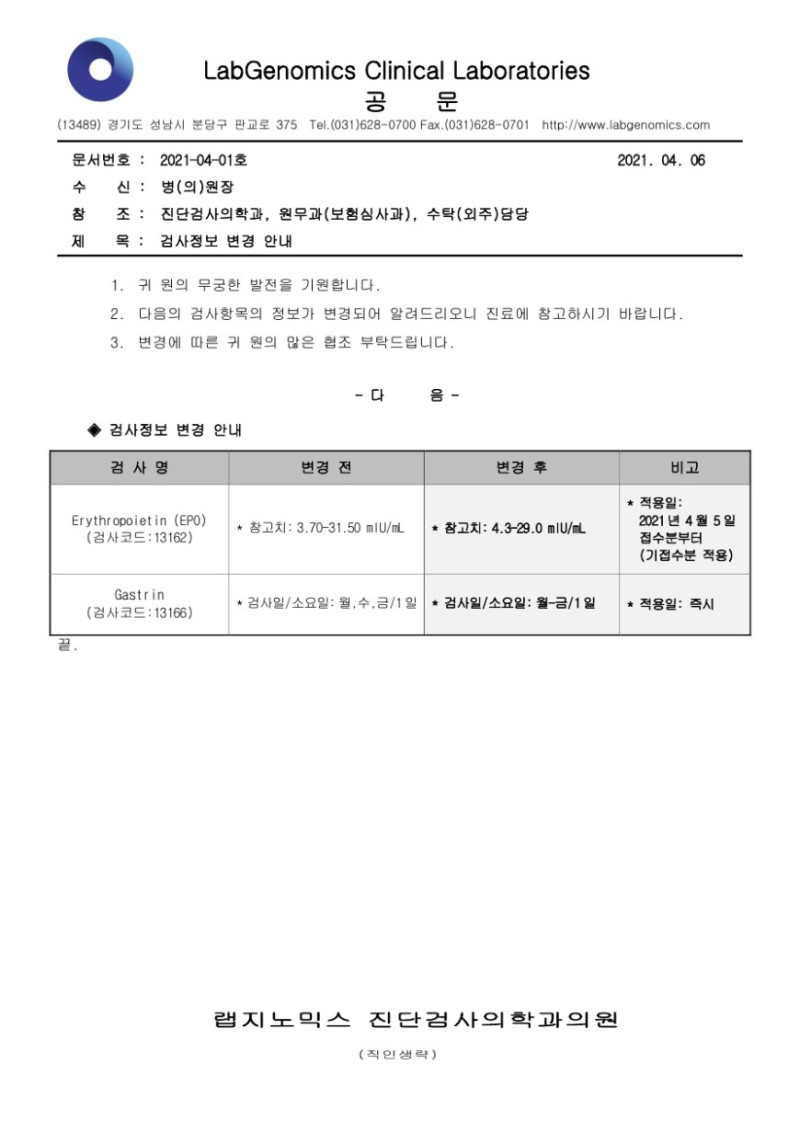 [공문] Erythropoietin (EPO) 외 1항목 검사정보변경안내 슈퍼관리자 2021-04-06 09:00:00 슈퍼관리자 0 578 2021.04.06 09:00 2025.03.21 13:09 공문2021-04-01호 Erythropoietin EPO 외 1건 검사정보변경안내 20210406.pdf (90.2K) 1. 귀 원의 무궁한 발전을 기원합니다. 검사정보 변경이 있어 다음과 같이 알려드리오니 업무에 참고하시기 바랍니다. 2. 주요내용: - Erythropoietin (EPO) (검사코드:13162) : 참고치 변경안내 * 적용일시: 2021년 4월 5일 접수분부터(기접수분 적용) - Gastrin (검사코드:13166) : 검사일/소요일 변경안내 * 적용일시: 즉시