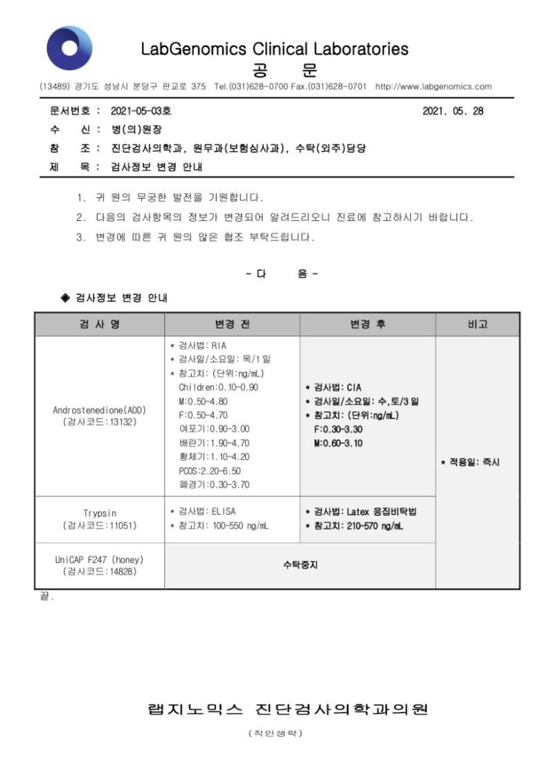 [공문] Androstenedione(ADD) 외 2항목 검사정보변경안내 슈퍼관리자 2021-05-28 09:00:00 슈퍼관리자 0 635 2021.05.28 09:00 2025.03.21 13:22 공문2021-05-03호 AndrostenedioneADD 외 2항목 검사정보변경안내.pdf (96.9K) 1. 귀 원의 무궁한 발전을 기원합니다. 검사정보 변경이 있어 다음과 같이 알려드리오니 업무에 참고하시기 바랍니다. 2. 주요내용: - Androstenedione(ADD) (검사코드:13132) : 검사법/검사일/소요일 /참고치 변경안내 * 적용일시: 즉시 - Trypsin (검사코드:11051) : 검사법/참고치 변경안내 * 적용일시: 즉시 - UniCAP F247 (honey) (검사코드:14828) : 수탁 중지 안내 * 적용일시: 즉시