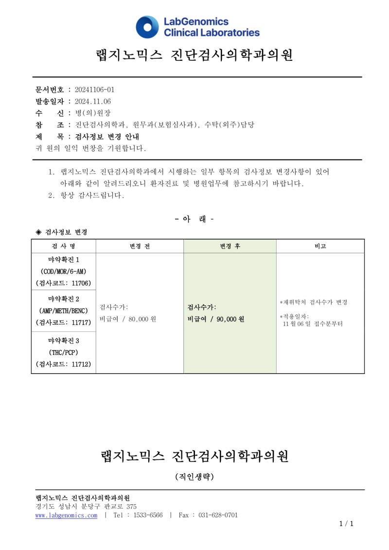 공문[20241106-01호]마약확진검사 3항목 검사정보변경 안내 최고관리자 2025-01-08 22:00:49 최고관리자 0 650 2025.01.08 22:00 2025.01.08 22:00 공문[20241106-01호]마약확진검사3항목검사정보변경안내.pdf (129.8K) 공문[20241106-01호]마약확진검사 3항목 검사정보변경 안내에 대하여 공유드리오니 업무에 참고하시기 바랍니다.