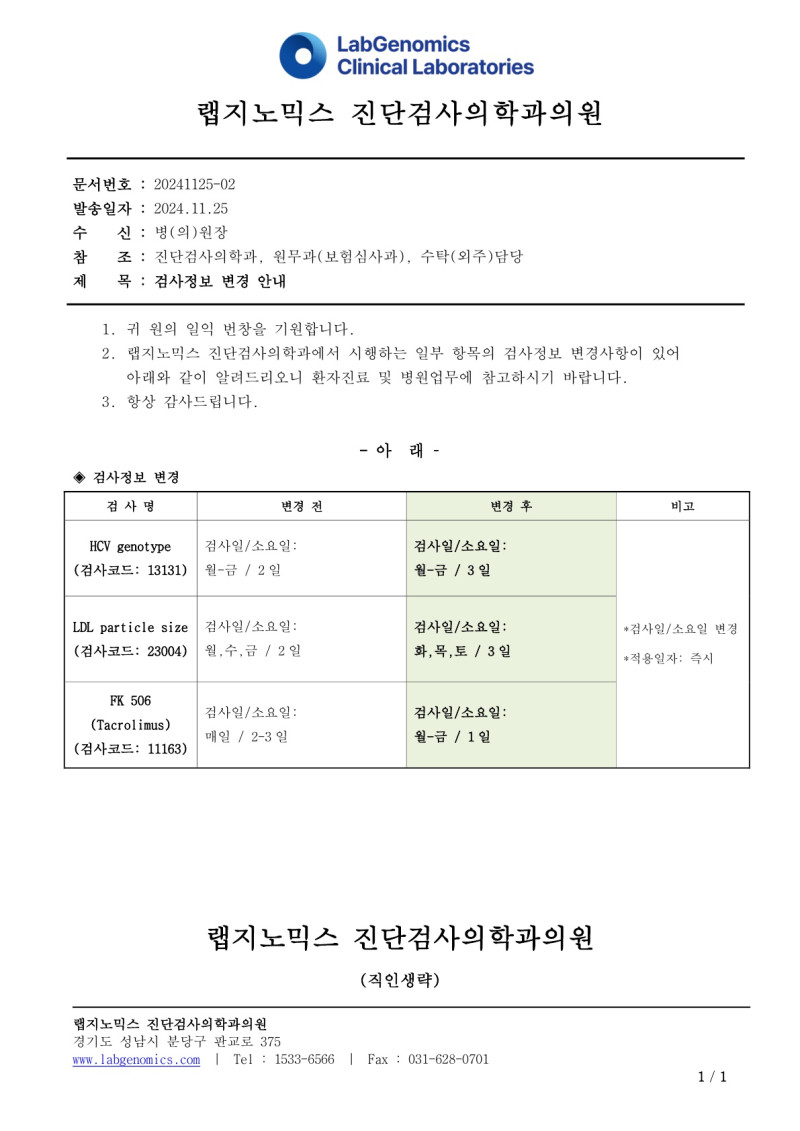 공문[20241125-02호]HCV genotype외 2항목 검사정보변경 안내 최고관리자 2025-01-08 22:02:16 최고관리자 0 618 2025.01.08 22:02 2025.01.08 22:02 공문[20241125-02호]HCVgenotype외2항목검사정보변경안내.pdf (130.8K) 공문[20241125-02호]HCV genotype외 2항목 검사정보변경 안내에 대하여 공유드리오니 업무에 참고하시기 바랍니다.