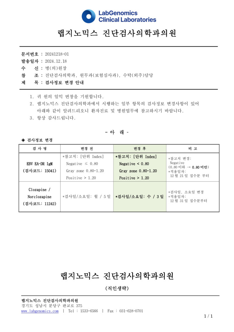 공문[20241218-01호]EBV EA-DR IgM외 1항목 검사정보변경 안내 최고관리자 2025-01-08 22:03:44 최고관리자 0 608 2025.01.08 22:03 2025.03.21 12:54 공문[20241218-01호]EBVEA-DRIgM외1항목검사정보변경안내.pdf (132.4K) 공문[20241218-01호]EBV EA-DR IgM외 1항목 검사정보변경 안내에 대하여 공유드리오니, 업무에 참고하시기 바랍니다.